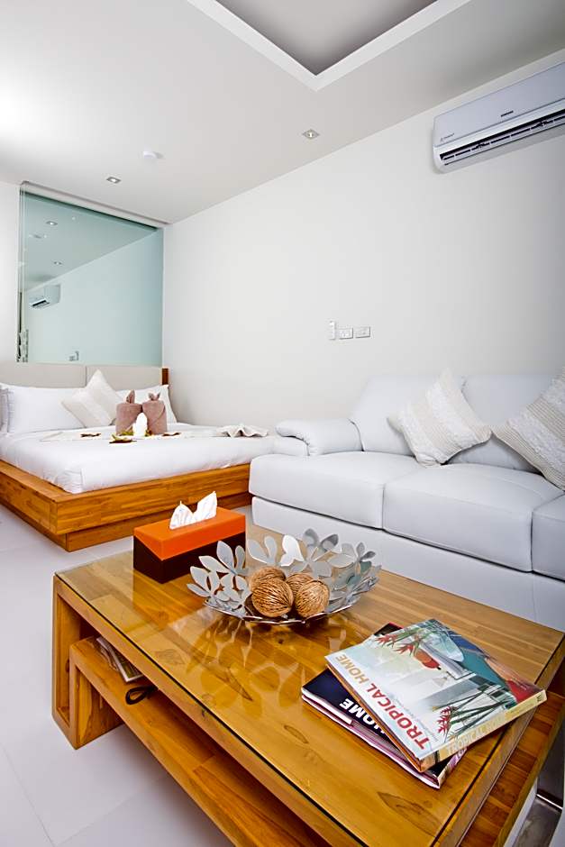 Featuring light color tones, this studio offers a 36-inch LCD TV with satellite channels. The unit features a leather sofa, air conditioning and a ceiling fan. Floor to ceiling glass front windows open onto a juliet balcony that overlooks the pool area. The private bathroom is equipped with a rain shower.